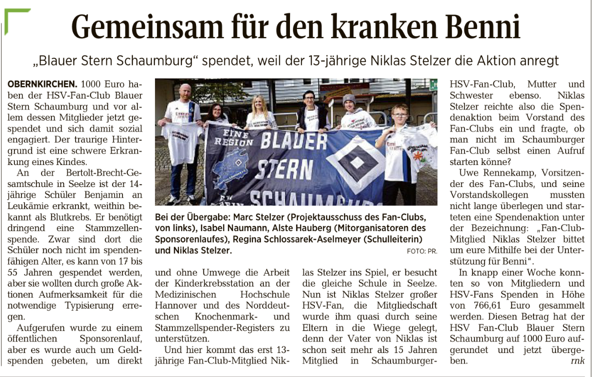 An der Berthold-Brecht-Gesamtschule in Seelze ist der 14-jährige Schüler Benjamin an Leukämie erkrankt. Benni ist ein Schulkamerad unseres Fan-Club Mitglieds „Niklas Stelzer“.